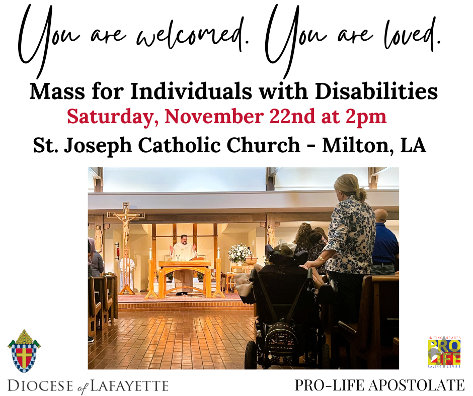 On Saturday, November 22, 2025, join Bishop Deshotel for a Mass for Individuals with Disabilities at St.Joseph Church in Milton, sponsored by the Office of Pro-Life Apostolate. The Mass will feature dim lighting, ample space to move around and alternative seating options.